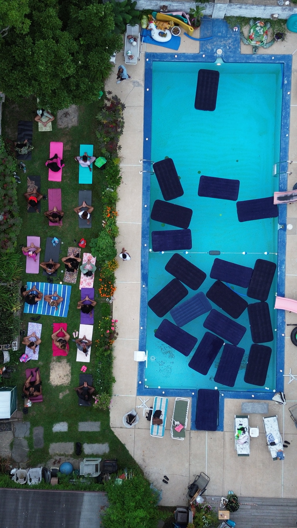 The full SereniTea Float flow - Chat & Chew, yoga, aromatherapy, floating sound bath, bites, cocktails, and tea.